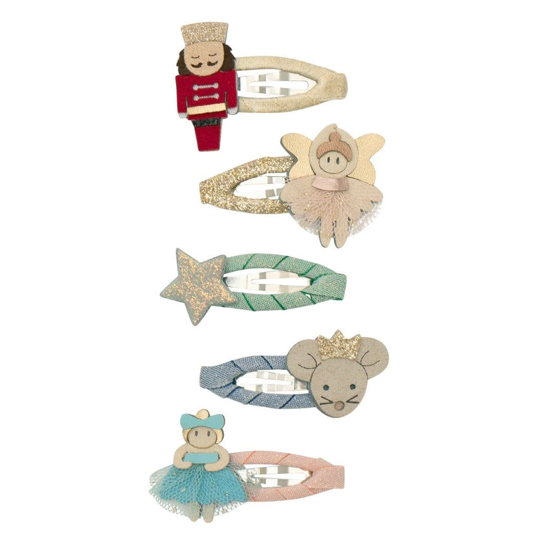 • 小さなくるみ割り人形、妖精、バレリーナ、ネズミ、キラキラ輝く星が飾られたクリップは、マット、メタリック、グリッターの美しい生地を組み合わせて精巧に作られています。