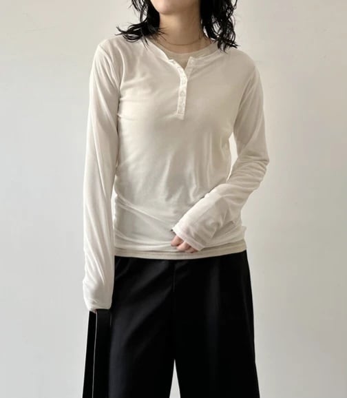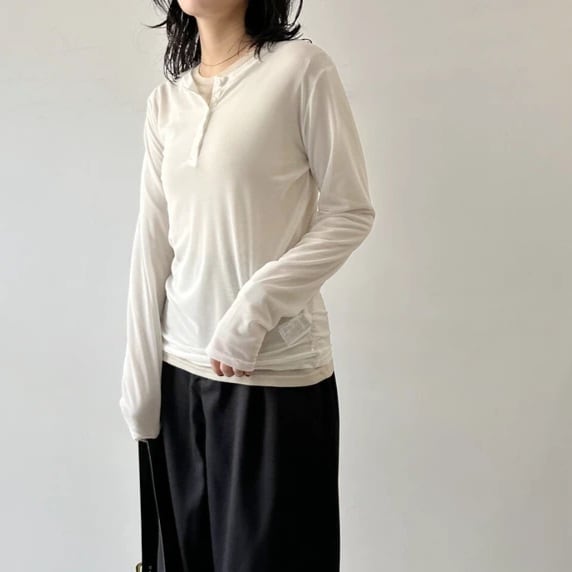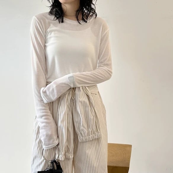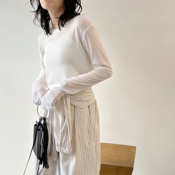 ・アウターにはメッシュ素材のカットソー、インナーにはシアー感のある