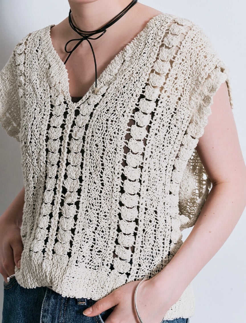 立体感が特徴的なクロシェ編みで仕立てたノースリーブトップス。